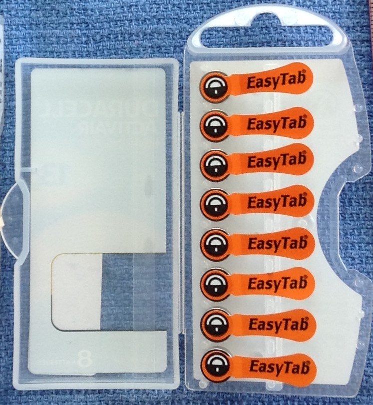 Hearing aid batteries. All are manufactured by Varta of Germany, regardless of labeling. All are PR48, 1.45V size with ‘easy tab’. Click on the right and left arrows to view all: