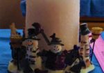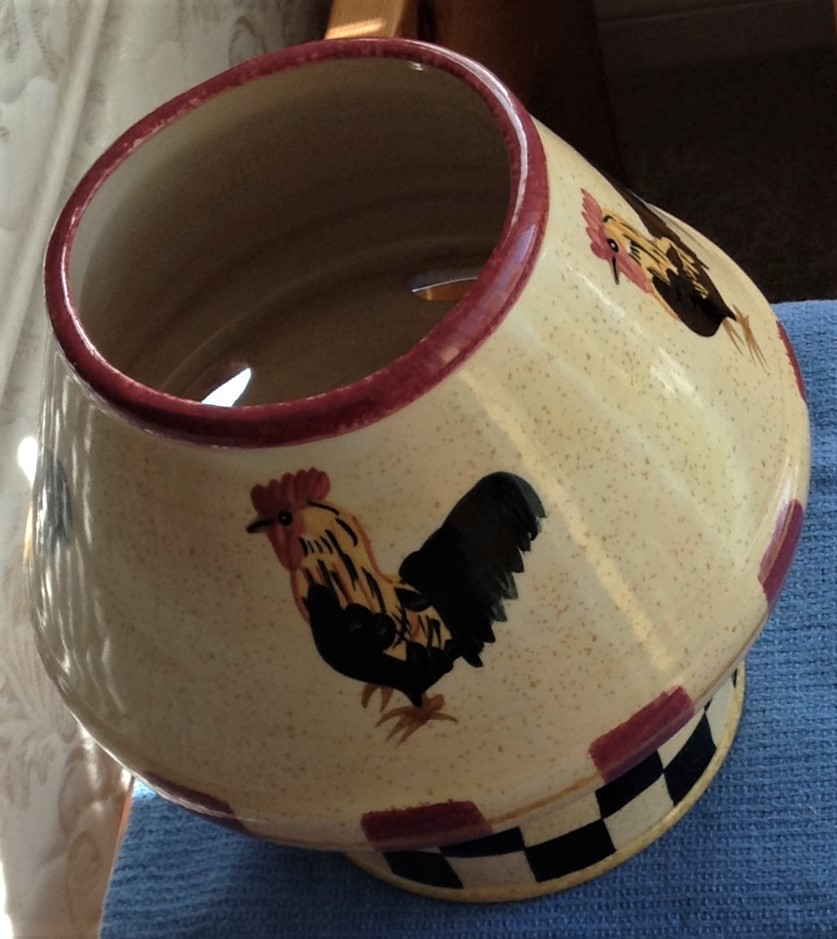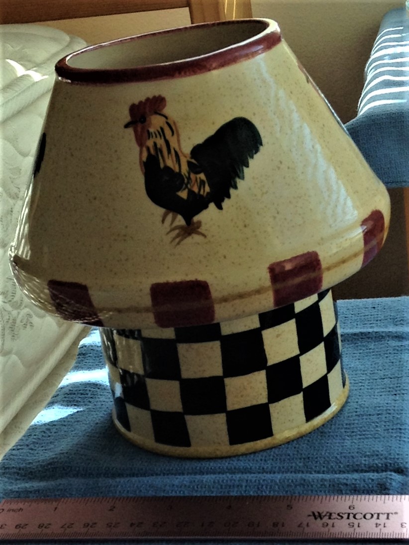 Sturdy glazed rooster candle holder, 2 pieces, holds large candle. 7″ x 7″. $10