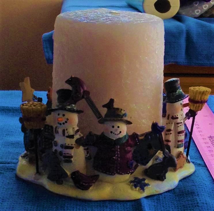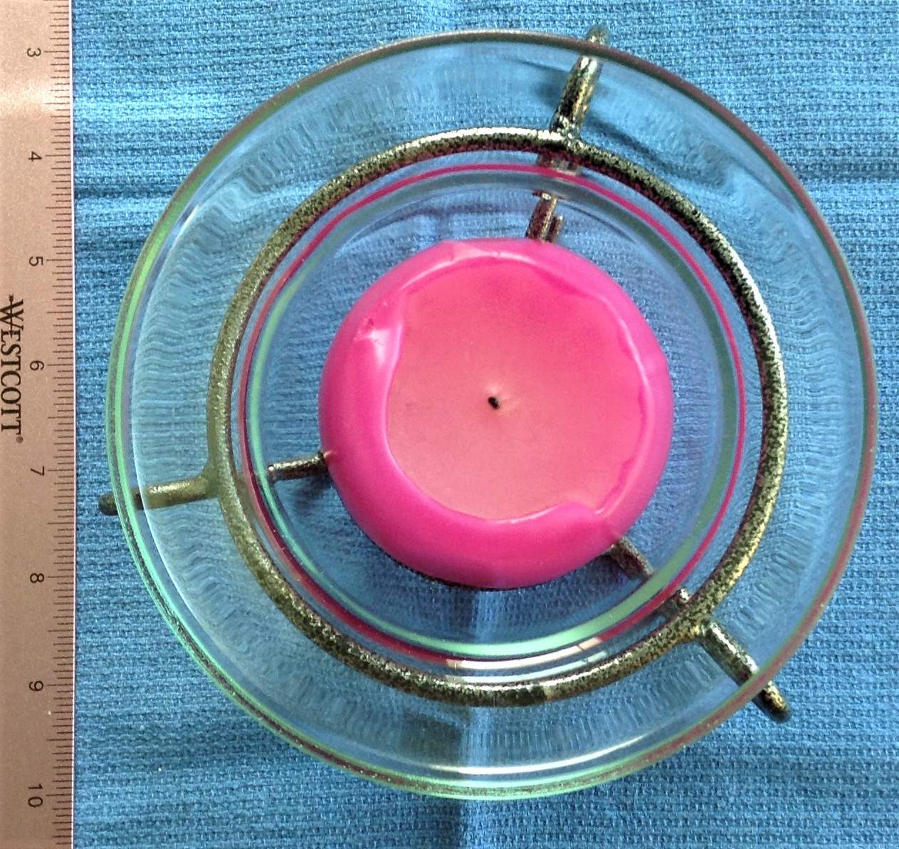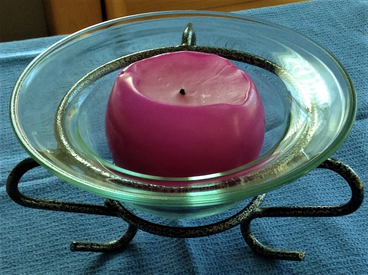 Glass and metal holder with pink round candle, 6″ across. $6.